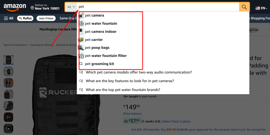 - Use Amazon Auto-Suggest: Type your seed keyword into the search bar and note the suggested completions (buyers are actually searching for these). For example, typing in “backpack” revealed multiple other variations that can be used.