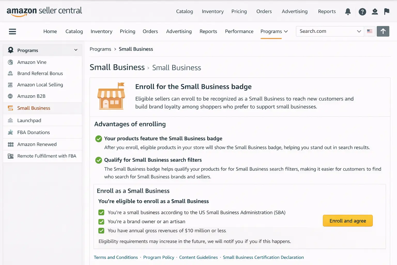 Navigate to Seller Central > Programs > Small Business (availability may vary by region and account type).