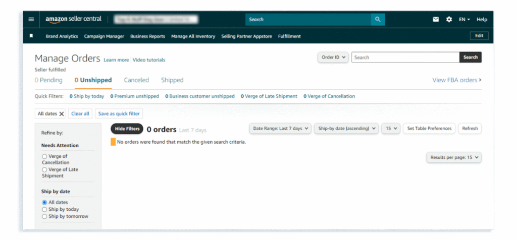 Amazon frequently updates Seller Central’s layout, so some sellers may see “Manage Orders” listed separately, while others are taken there automatically. Both experiences are normal.